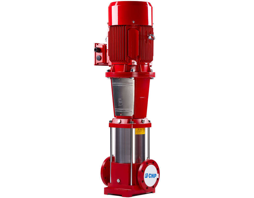 非自吸立式多級電動機消防泵組,電機軸通過聯軸器直接與泵軸聯接,葉輪導葉采用不銹鋼板沖壓焊接或不銹鋼精密鑄造制成,泵進出水口在泵底同一直線上。